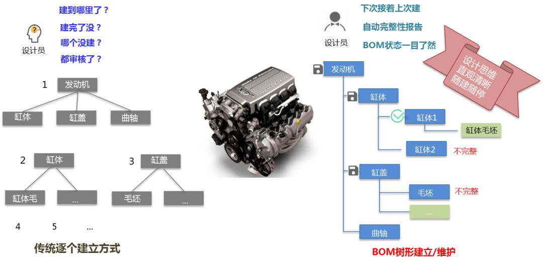 通过BOM树型建立、树型维护功能,让设计员能换一种思维,以更加符合业务习惯和思路的方式帮助设计员快速、便捷、高效及直观、有效的工作。更符合企业在初期大批量灌入BOM后,根据企业的发展调整、构建新产品、新业务,快速有效应对个性化、定制性的大趋势。